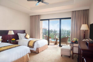 Nhìn từ trên cao xuống, khu nghỉ dưỡng Vinpearl Resort & Spa nổi bật giữa màu xanh của cỏ cây, nước biển nhờ sắc đỏ tươi tắn của mái ngói các ngôi biệt thự. Mỗi căn biệt thự đều được trang bị đầy đủ tiện nghi, rộng rãi, phục vụ du khách có một kỳ nghỉ tuyệt vời bên gia đình và người thân